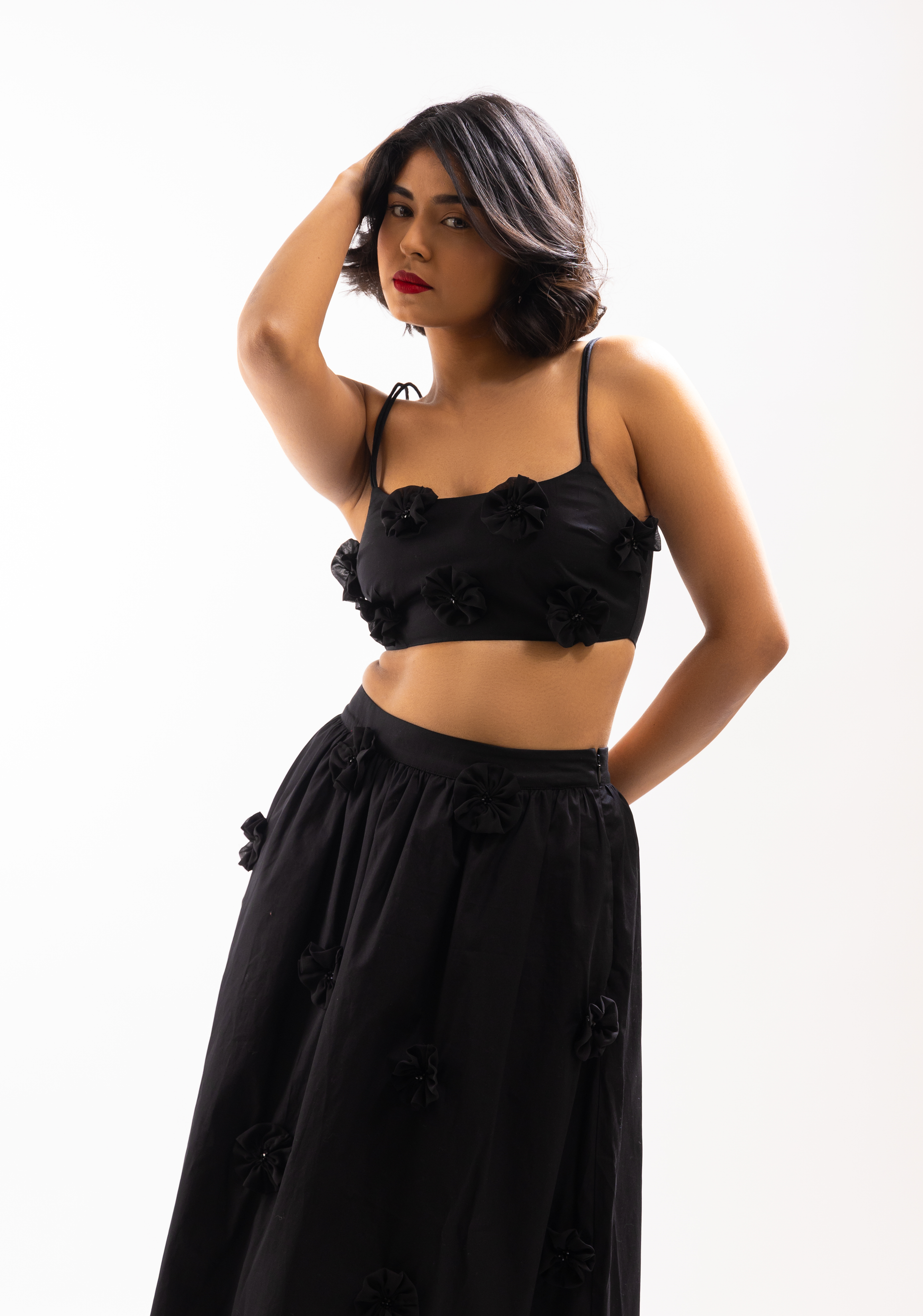 Double strap top with flower and beads applique detail. Plunge neckline with hook and eye placket at the back.