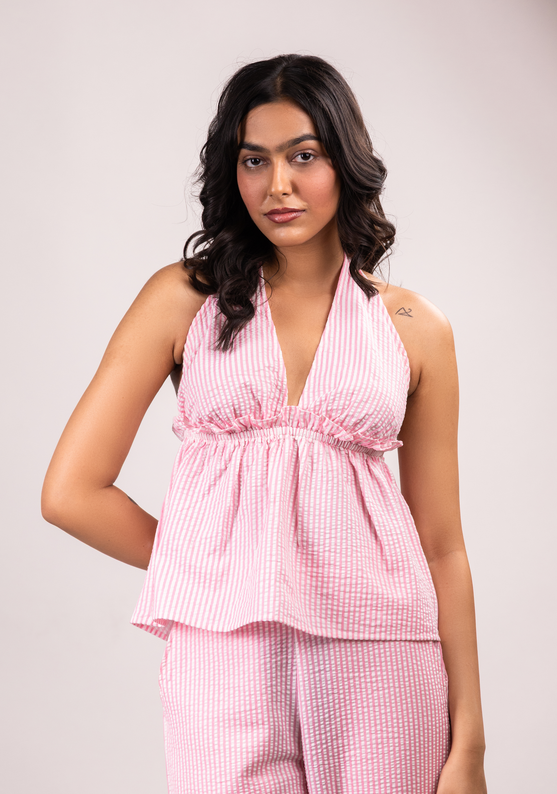 Halter neck tie top. Elasticated at the back and ruffle detail on the waist.