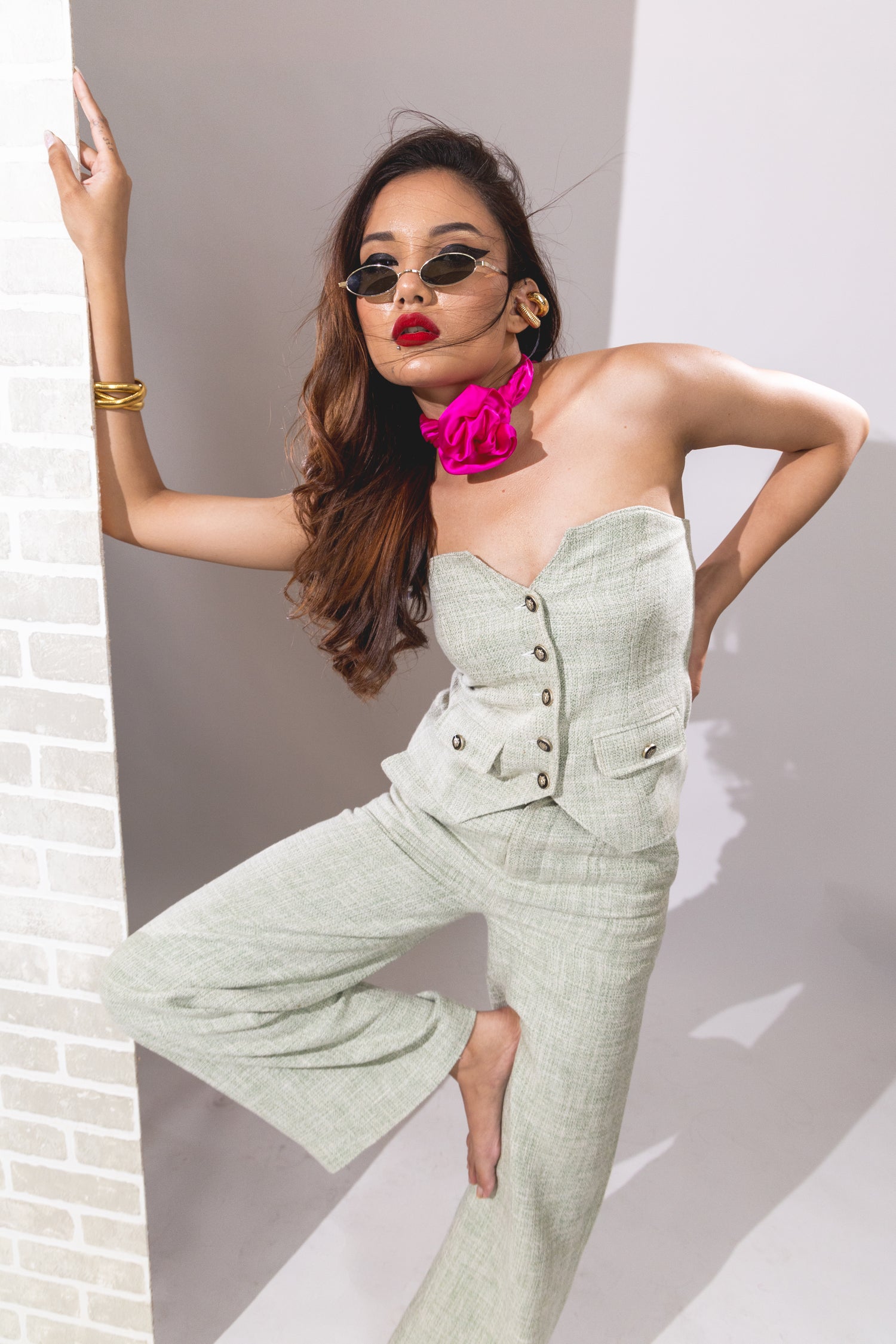 Corset top with a straight neckline and exposed shoulders. Flap non-functional pockets. Front fastening with black & golden buttons.