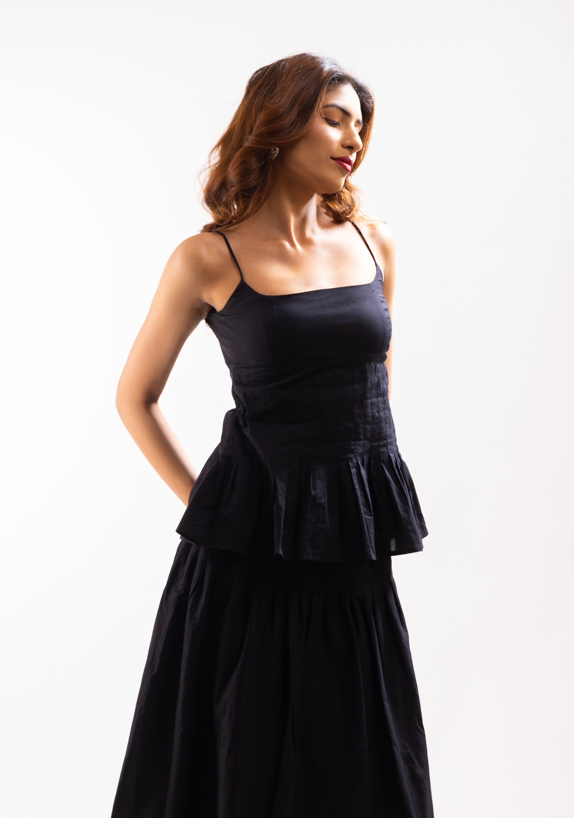 Square neck top with spaghetti straps. Featuring pleats and a zipper at the back.