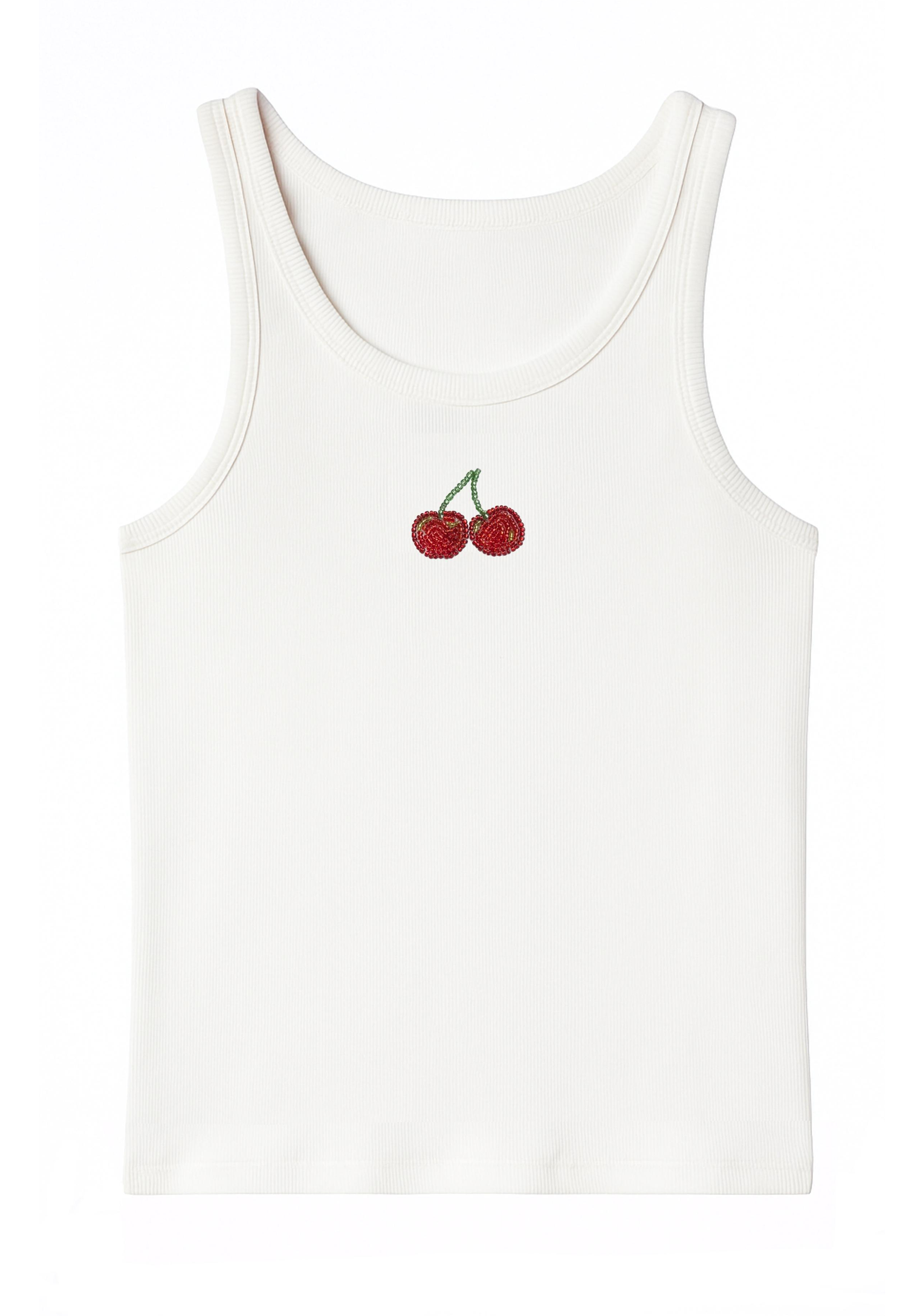 Cotton ribbed tank top featuring hand- done cherry beaded embroidery.